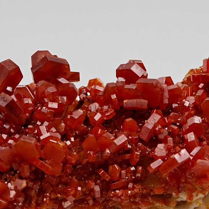 De la colección de minerales completamente naturales, raros e importantes: se propone este ejemplar de Barita tachonada de Vanadinita, de alto valor estético. El mineral aparece como una tormenta de cristales, con un vestido cristalino hexagonal, de color rojo sangre brillante e intenso, sobre un manto de crestas de barita amarillas. Los coleccionistas saben cuánto se aprecian y buscan los minerales de este tipo. La peculiaridad de este ejemplar radica en la rareza, tamaño y calidad de los cri…