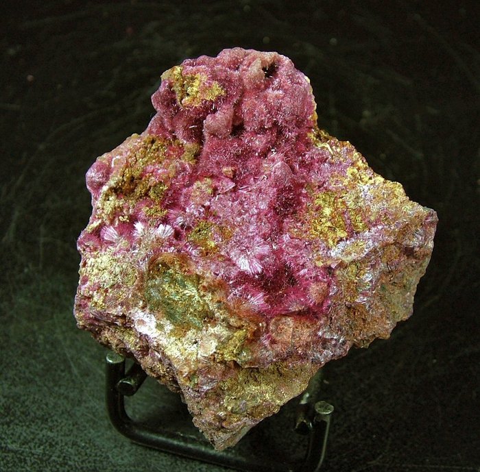 Cristales aciculares de eritrita de bello color fucsia intenso, que forman agregados rayados. Muestra recogida a finales de los años 1990. Fotografiada bajo luz intensa. CW1990.