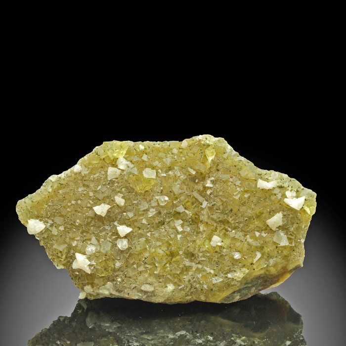 Un fino espécimen de fluorita del tamaño de un gabinete de la mina Moscona, Villabona, Asturias, España, una de las localidades de fluorita más famosas de Europa, reconocida por producir material excepcionalmente bien cristalizado en una amplia gama de colores. El ejemplar muestra una densa alfombra de cristales cúbicos de Fluorita bien terminados, de color amarillo cálido a amarillo oliva, con buena transparencia y brillo vítreo en todas partes. Esparcidas por la superficie hay placas de cris…