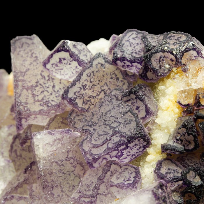 Un sorprendente espécimen de fluorita que presenta cristales cúbicos afilados y bien formados con una zonación de color púrpura intenso, característica de la localidad de Qinglong. Acompañado de pequeños y finos cristales de cuarzo que añaden detalle extra y contraste a la pieza. Los patrones geométricos internos crean una fuerte profundidad visual y hacen que este material sea instantáneamente reconocible entre los coleccionistas. Esta fluorita estética y de alta calidad muestra una transparen…